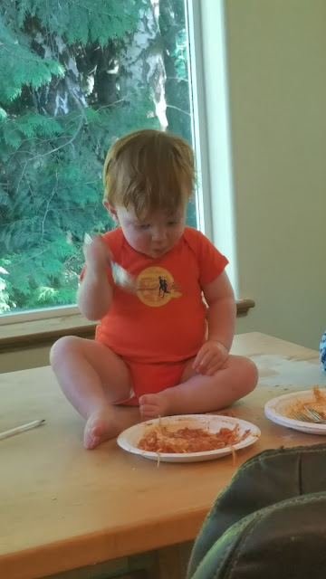 Max loves his food. Good thing this food matches his shirt that matches his hair.